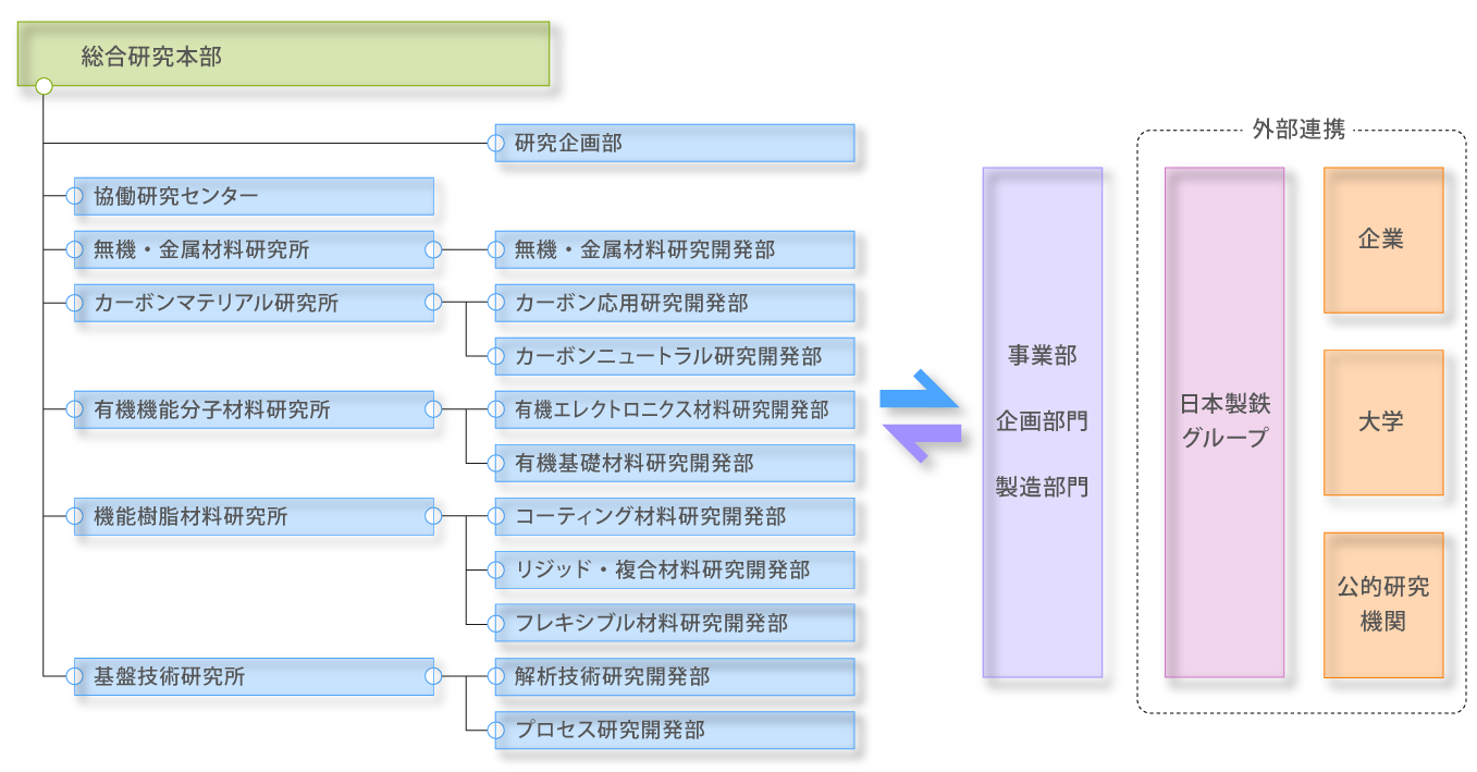 研究開発>研究開発体制 ページを移る 研究開発 HOME 研究開発体制 研究開発拠点 研究開発体制 当社グループの研究開発への取り組みは、幅広い領域をカバーする総合研究本部の各センターを中核とする体制に加え、世界トップレベルの先端技術を誇る、日本製鉄(株)技術開発本部の各研究所や大学・企業、公的研究機関との連携も大きな強みとなっています。 ページを移る 研究開発 HOME 研究開発体制 研究開発拠点
