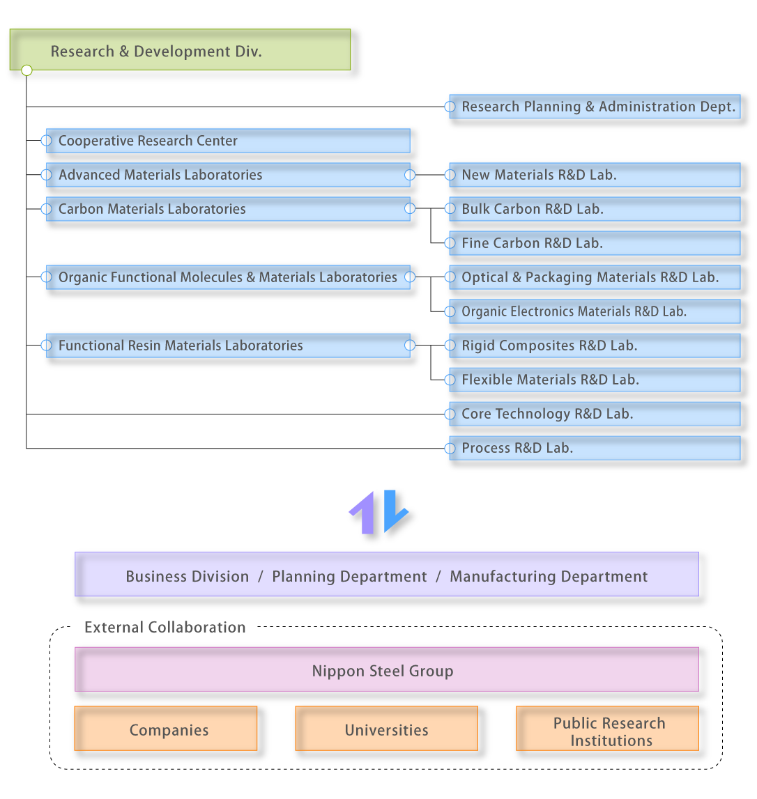Our group’s research and development initiatives are supported not only by a framework centered on the various centers of our Comprehensive Research & Development Division—covering a broad range of technological fields—but also by strong collaborations with the world-class research institutes of Nippon Steel Corporation’s Technical Development Bureau, as well as with universities, companies, and public research organizations.